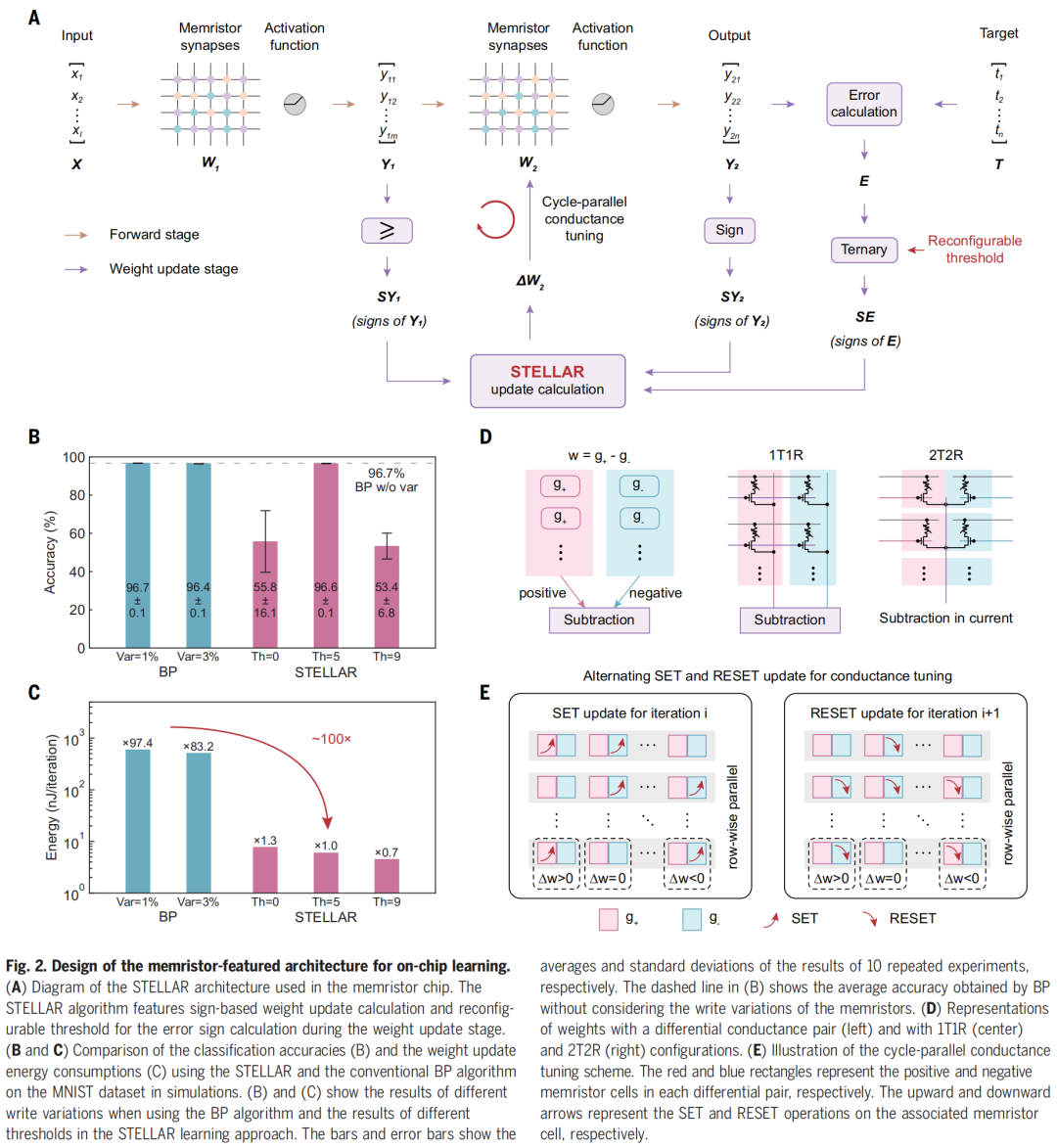 下图 2 为用于片上学习的忆阻器特征架构设计,A 为忆阻器芯片中使用的 STELLAR 架构,B 和 C 为分类准确率的比较,D 为具有差分电导对(左)以及 1T1R(中)和 2T2R(右)配置的权重,E 为循环并联电导调整方案。