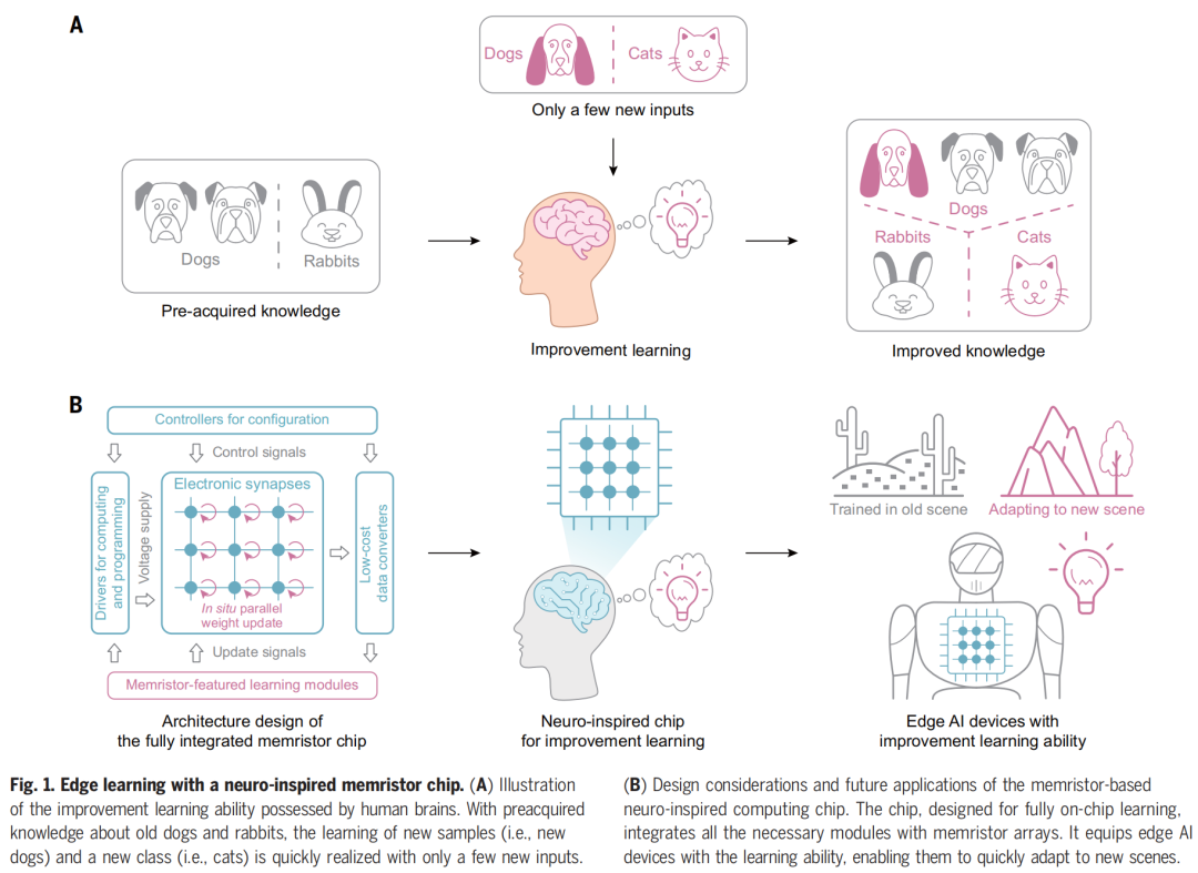 使用神经启发忆阻器芯片的边缘学习的示意图如下所示。图1展示了人类大脑具备的改进学习能力。图2展示了基于忆阻器的神经启发计算芯片的设计和未来应用。这种芯片被设计为完全片上学习,将所有必要的模块与忆阻器阵列集成在一起,使得边缘AI设备具备了学习能力,能够快速适应新的场景