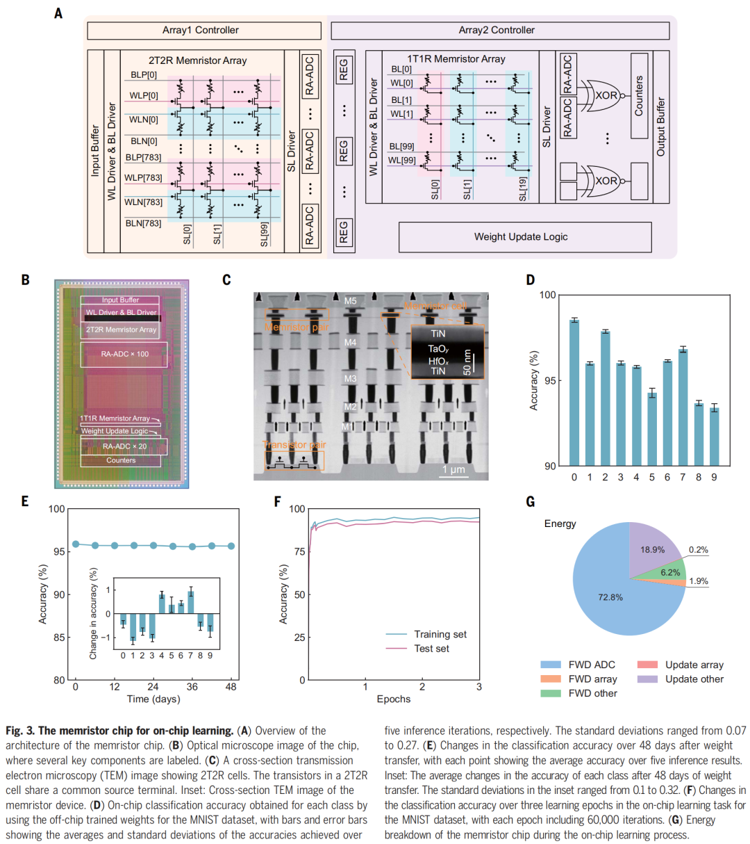 下图 3 为用于片上学习的忆阻器芯片,A 为架构概览,B 为芯片的光学显微镜图像,C 为 2T2R cell 的横截面透射电子显微镜图像。
