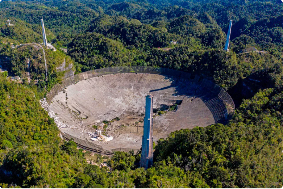 美国波多黎各的阿雷西博(Arecibo)射电天文望远镜在2020年因为支撑结构老化而发生断裂,导致支撑塔尖折断,进而导致重达900吨的信号接收设备坠落,同时钢缆也摧毁了部分望远镜表面