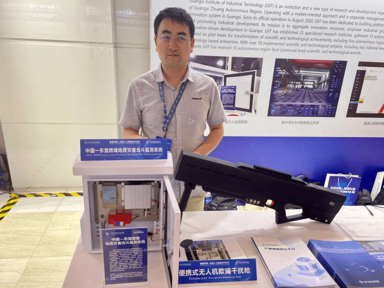 现场展示的中国—东盟跨境地质灾害北斗监测系统及便携式无人机欺骗干扰枪(奉澄洁 摄)