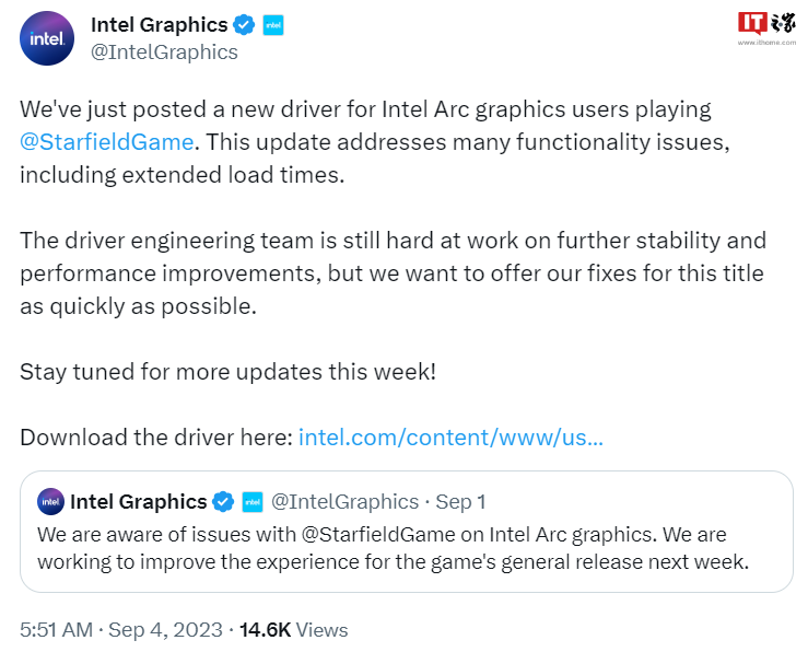 本站 9 月 4 日消息,英特尔显卡发布新驱动适配《星空》,版本号为 31.0.101.4672,此更新解决了许多功能问题,包括显著减少加载时间,支持 Arc A 系列显卡和锐炬 Xe 显卡,点此下载。