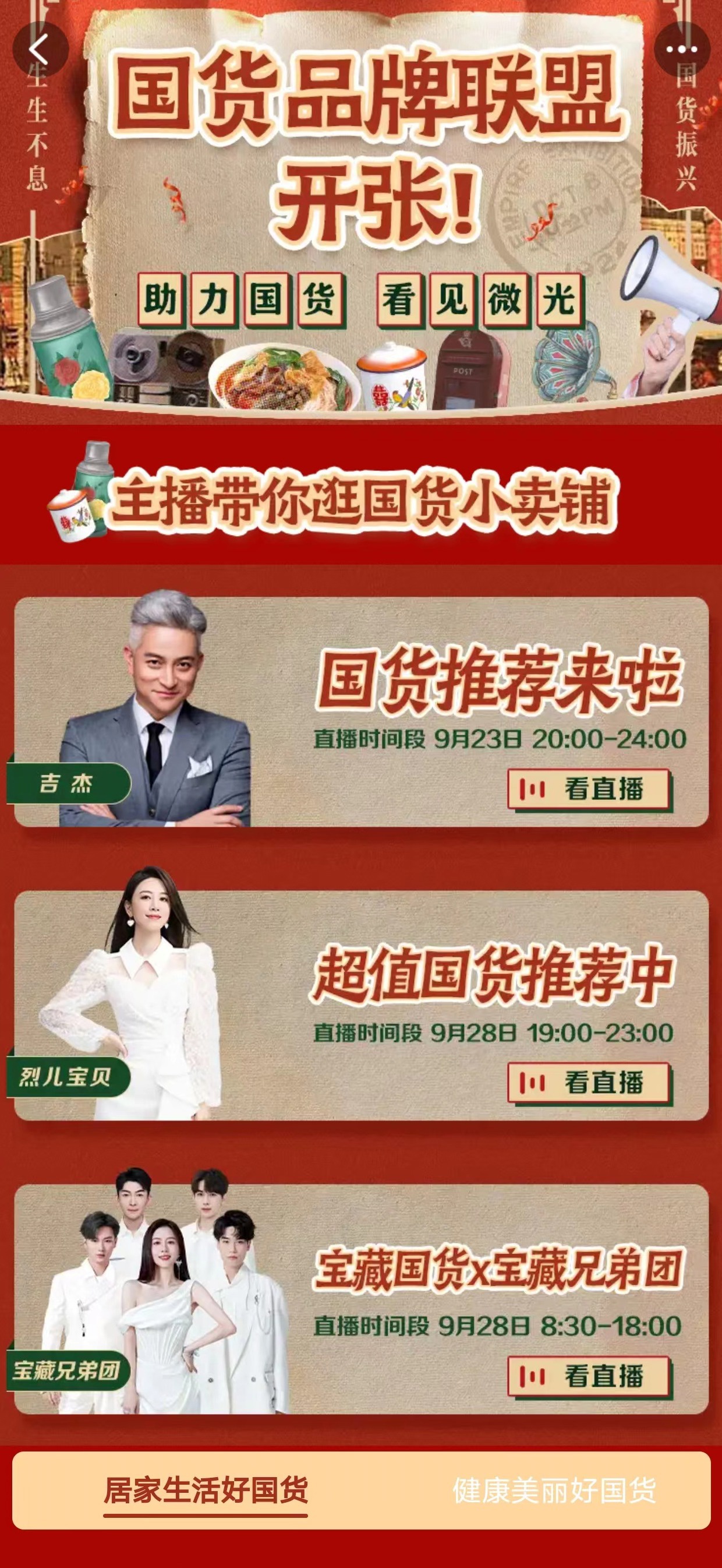 在“国货品牌联盟”中,我们注意到各大主播将按照时间段推荐国货。例如,在vivo直播间中,可以领取专属券,金额在200元至50元之间不等