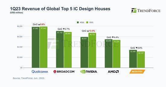 根据TrendForce的统计数据显示,高通仍以23.5%的市场份额占据着IC行业的主导地位。该公司的智能手机部门实现了6.1%的环比增长,这主要归功于骁龙二代的发布,以及三星和一加等主要零售商采用了旗舰芯片组。