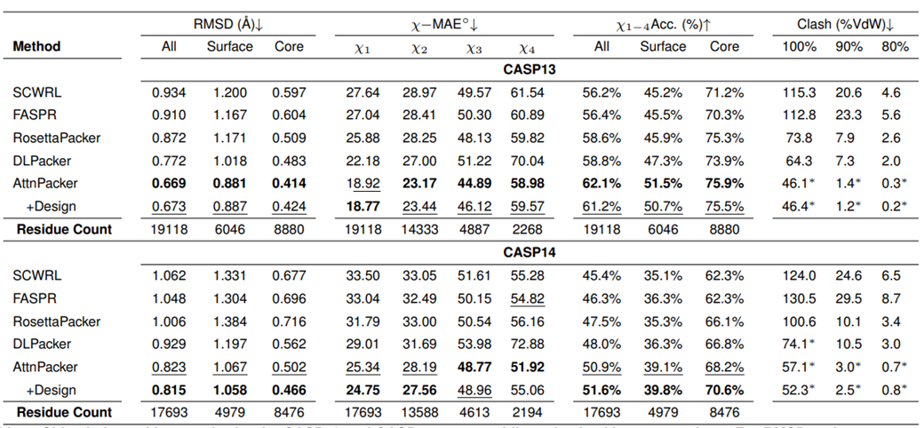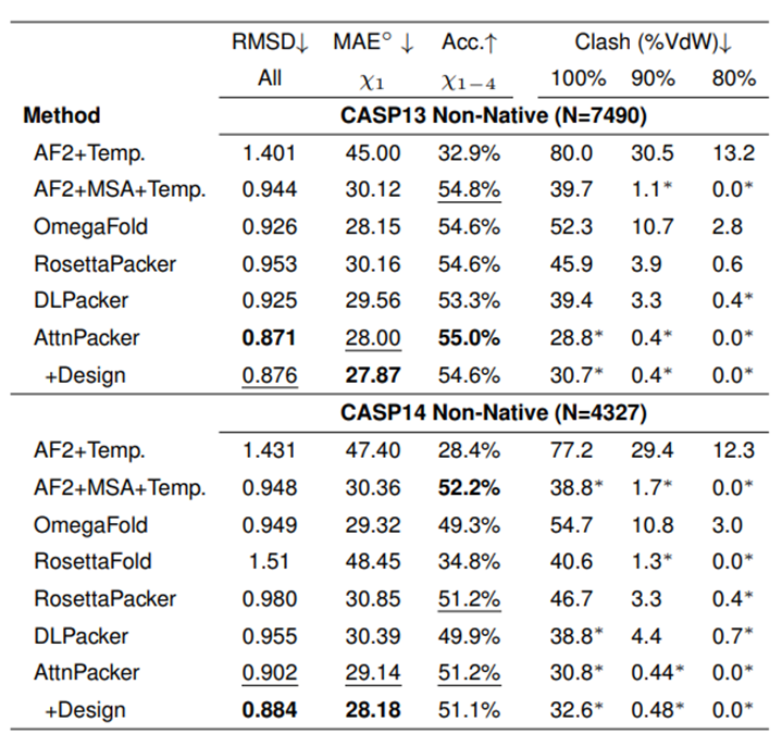 在 CASP13 和 CASP14 非天然主链上,AttnPacker 也明显优于其他方法,原子碰撞也明显少于其他方法。