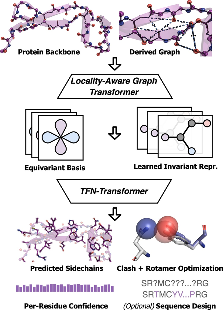 AttnPacker 运行流程。以蛋白质主链坐标和序列作为输入,并基于坐标信息导出空间特征图和等变基。特征图由不变量 graph-transformer 模块处理,然后传递给一个等变的 TFN-Transformer 输出预测的侧链坐标、每个残基的置信度分数和可选的设计序列。预测坐标经过后处理,以去除所有空间冲突,并确保理想化的几何结构。