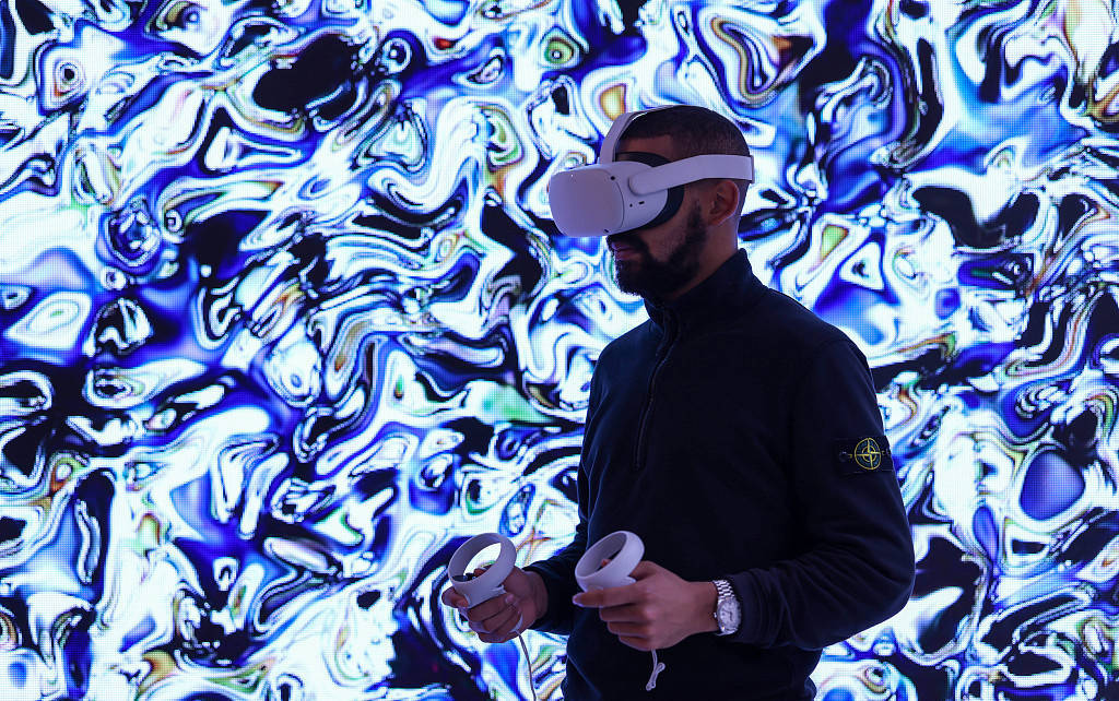 当地时间2022年11月10日,英国伦敦,一名参观者戴着VR,观看艺术作品。