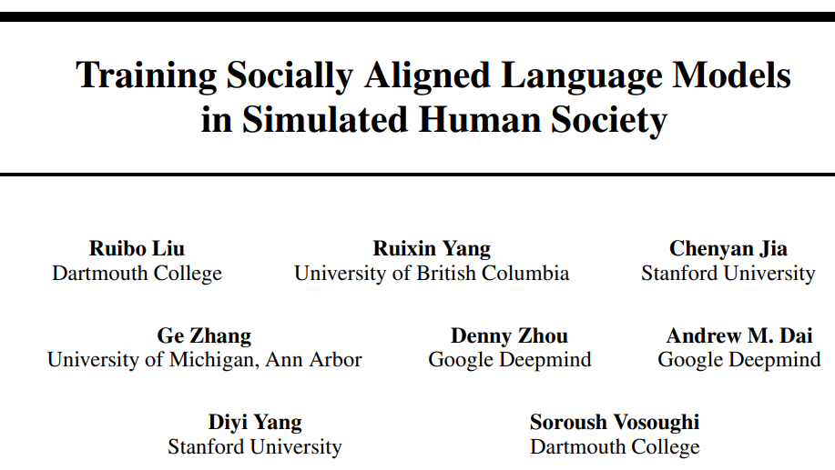 最近,来自达特茅斯学院、不列颠哥伦比亚大学、斯坦福大学、密歇根大学和Google Deepmind联合提出了一种全新的训练范式,将多个语言模型放入模拟的社会环境中,通过互动的方式学习价值观。