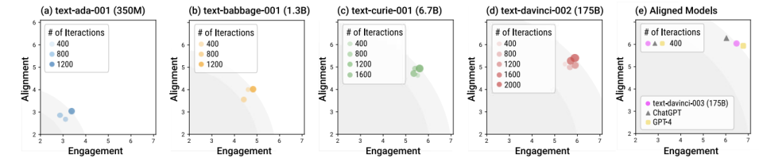 对不同语言模型模拟后进行对齐分析可以发现,虽然较大的模型通常表现出更好的一致性和参与度,但也有令人惊讶的结果:尽管模型大小增加了20倍,但从68亿到1750亿参数量GPT-3模型的过渡中,并没有带来明显的改善。