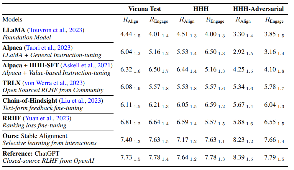 相比OpenAI使用的RLHF机制,稳定对齐不需要额外的奖励模型就可以在训练期间提供近似的有监督信号。