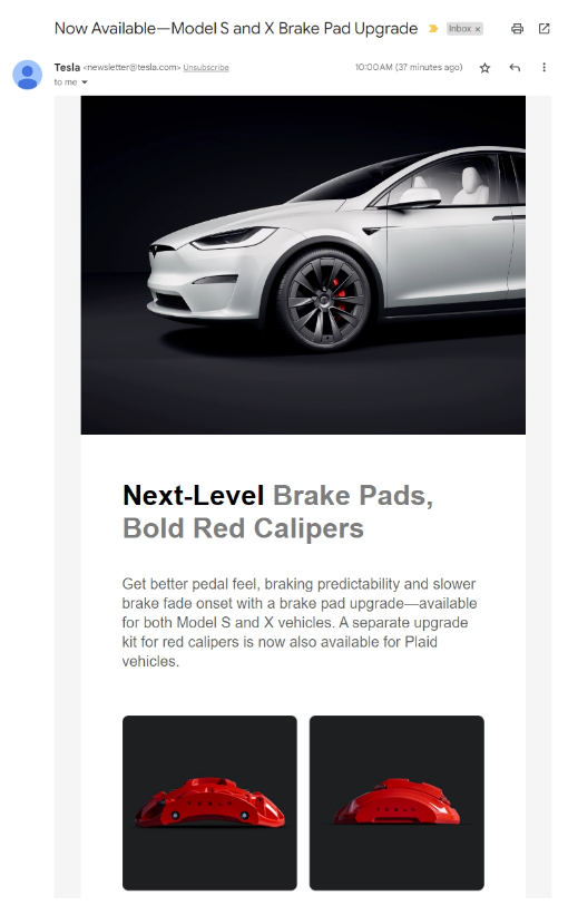特斯拉宣布推出了一项新的升级,包括了具有更高热容量的刹车片和引人瞩目的红色HTC卡钳套件。据特斯拉表示,这些升级将为车主们带来更卓越的驾驶体验,不仅提高了制动性能,还延长了刹车系统的寿命。据了解,升级刹车片套件适用于Model S和Model X,售价为750美元,约合人民币5475元;而红色HTC卡钳适用于Model S或Model X Plaid版本,售价高达2700美元,约合人民币19710元