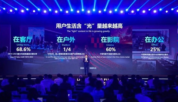 激光显示技术的广泛应用也可见一斑。在家庭客厅中,激光电视已成为家庭大屏的首选,不仅具有健康护眼功能,还提供震撼的观影体验。数据显示,从2015年到2022年,中国激光电视市场规模年复合增长率高达68.6%,成为家庭娱乐的主流选择。而在户外,激光投影也赢得了年轻人的青睐,成为移动观影和露营的新宠。今年6月的数据显示,国内线上激光光源智能投影产品销售额占比超过25%。同时,激光影厅在电影院中越来越受欢迎,近六成电影银幕使用激光光源。此外,在办公和公共空间中,高亮度、高色域的激光商用投影也得到广泛应用,出货量增长超过25%,成为传统商用投影的有力替代品。