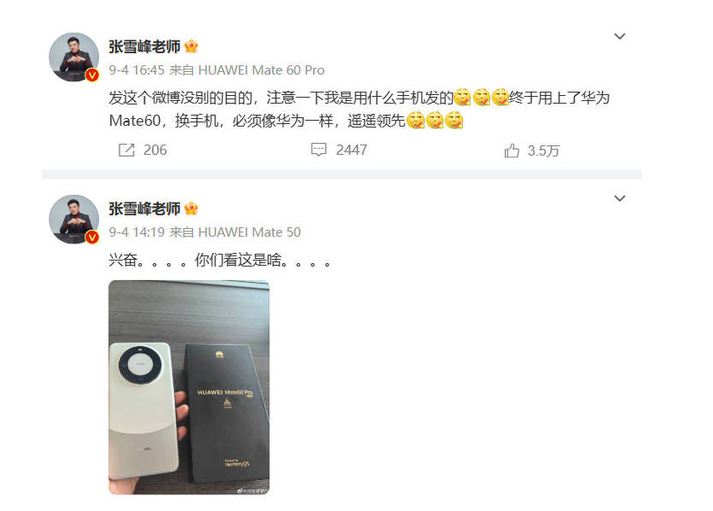 然而,尽管张雪峰曾抱怨,但似乎华为Mate60 Pro的吸引力最终还是战胜了他。不久之后,张雪峰宣布他已入手华为Mate60 Pro,并于9月4日正式开始使用。他在社交媒体上分享了这一消息,并表示:“注意一下我现在用的是什么手机,我终于追赶上了时代,换手机就要像华为一样,始终走在前列。”