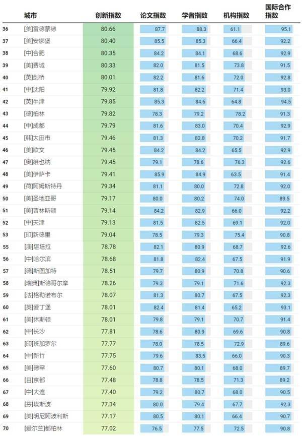 通过对创新指标分析得出,北京的创新指数位列全球前十,排名全球第二。而在论文、学者、机构和国际合作四个维度的得分中,北京居国内首位。香港、上海、杭州、深圳和南京的综合得分进入全球前二十,表现也十分亮眼。