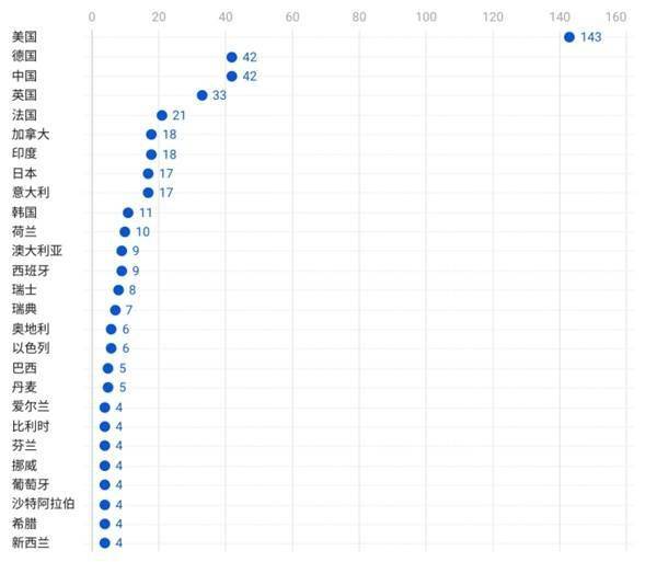 图表 1 全球人工智能创新城市前500城市数量4以上国家分布