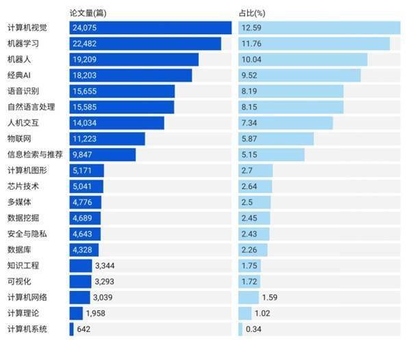虽然现在网络上有不同的语言说计算机视觉“已死”,但是从全球人工智能发表的论文中可以看出,计算机视觉方向的论文依然最多,有24075篇,占12.59%。