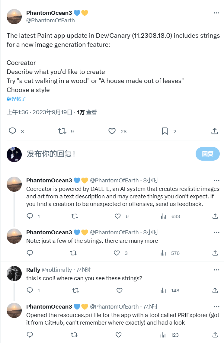 爆料人PhantomOcean3从新版画图的文件中发现了一段用于新图像生成功能的字符串,这个功能被命名为“Cocreator”