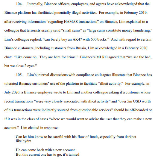 “Binance 的管理人员和员工承认,该平台为潜在的非法活动提供了便利,”报告称。