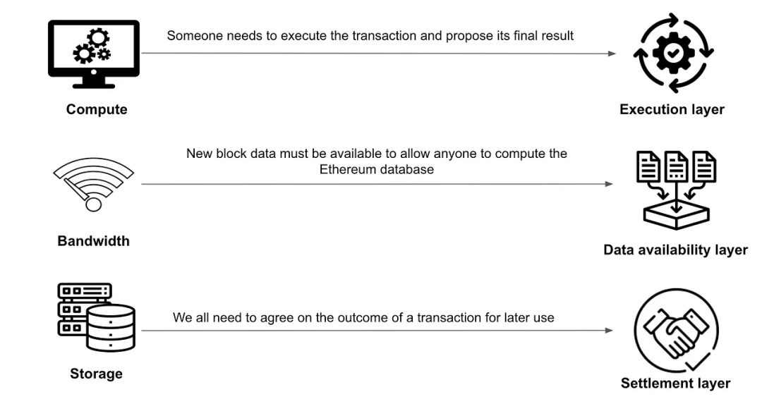 共识 → 数据可用性。所有验证者都达成了对数据排序的一致意见,proto-danksharding 有助于巩固这一角色。
