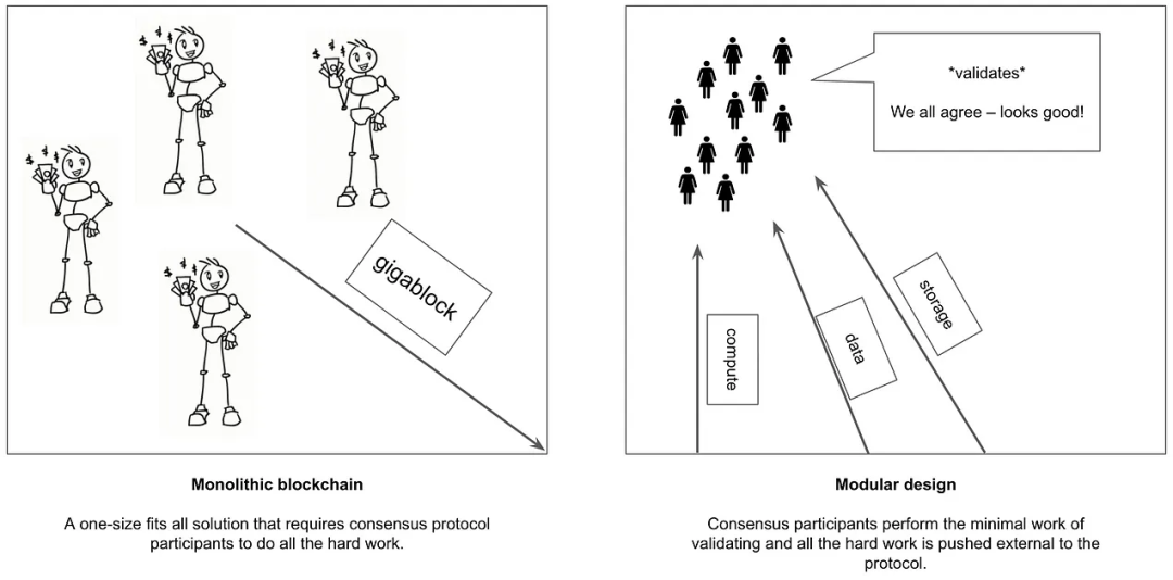 让我们快进几年,快进到区块大小战争之后。现在,我们有更好的术语来说明这个困境如何影响区块链系统的设计,即单一型区块链或模块化设计。