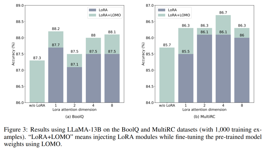 LOMO 和 LoRA 在本质上是相互独立的。为了验证这一说法,研究者使用 LLaMA-13B 在 BoolQ 和 MultiRC 数据集上进行了实验。结果如图 3 所示。