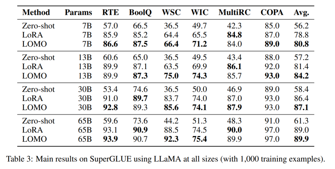 该研究评估了 LOMO 的内存和吞吐量性能,表明借助 LOMO,研究者在 8 个 RTX 3090 GPU 上就可以训练 65B 参数的模型。此外,为了验证 LOMO 在下游任务上的性能,他们应用 LOMO 来调优 SuperGLUE 数据集集合上 LLM 的全部参数。结果表明了 LOMO 对具有数十亿参数的 LLM 进行优化的有效性。