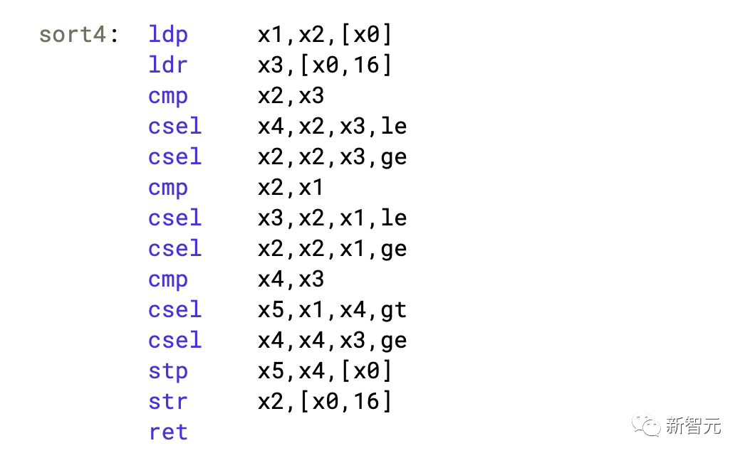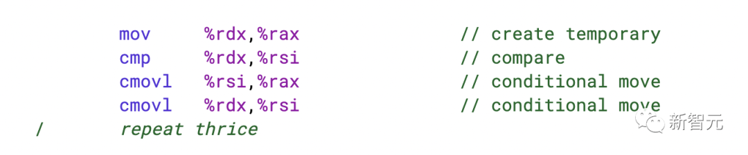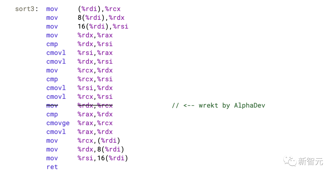 上面的代码是之前排序网络的最先进技术。现在,这就是DeepMind的新发现发挥作用的地方。他们发现有时上面的 mov 指令是不必要的。