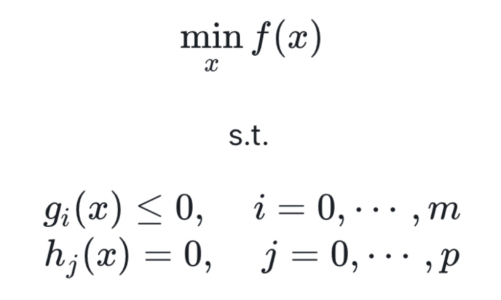 这里x是决策变量,f(x)是目标函数,g(x)是不等式约束条件,h(x)是等式约束条件,且有m=p=0。若有m=p=0,则问题转化为无约束优化问题。函数f,g,h可以是线性或非线性,经典的求解算法有:牛顿法、梯度下降法、共轭法等等。