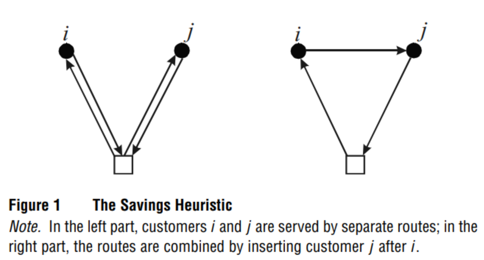 对于TSP问题,这类方法中的SOTA算法为Lin-Kernighan-Helsgaun (LKH),可解决的规模可以达到上万级别。对于VRP问题,根据求解过程,可分为 construction heuristic 和 improvement heuristic 两类。construction heuristic 用于构造一个初始可行解,常用的方法包括 Solomon I1 以及 saving heuristic (节约算法),后者的示意图如下所示。基本思想是将各客户点均与depot相连,构成若干条只含有一个配送点的线路;然后通过贪心规则,计算将点 i和点 j 连接在一条线路上距离的节约值;重复这个步骤,对线路进行合并。
