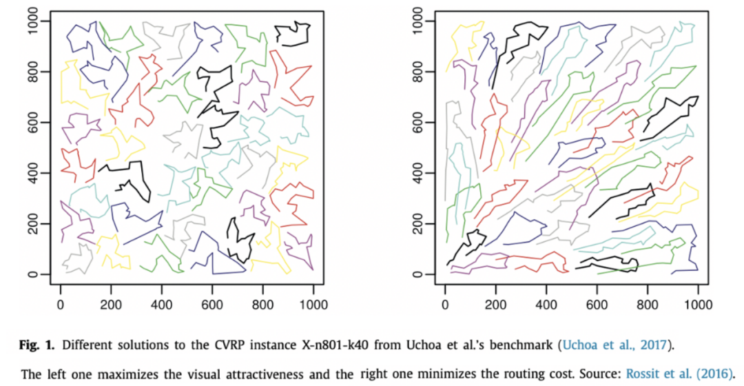 在VRP中,优化目标常是最小化总运输成本、行驶时间/距离、所需车辆数、时间窗违反量等等。这些目标有清晰、可量化的计算公式,而在工业实际中,常常需要车辆的行驶轨迹(路线)看起来 visual attractiveness,如路线之间没有覆盖或者交集(not overlapping、not crossing)。如下图,就分别示例了考虑 visual attractiveness(左图)、将总成本(右图)作为最小化目标的两个解决方案。显然,当考虑 visual attractiveness时,线路之间的交叉较少,看起来更加优美,更加易于算法方案的落地。在这种情况下,每个司机都集中在一个小区域内进行服务,意味着更高的操作效率,因为司机会更加熟悉片区内的交通、停车点、商户营业时间等。