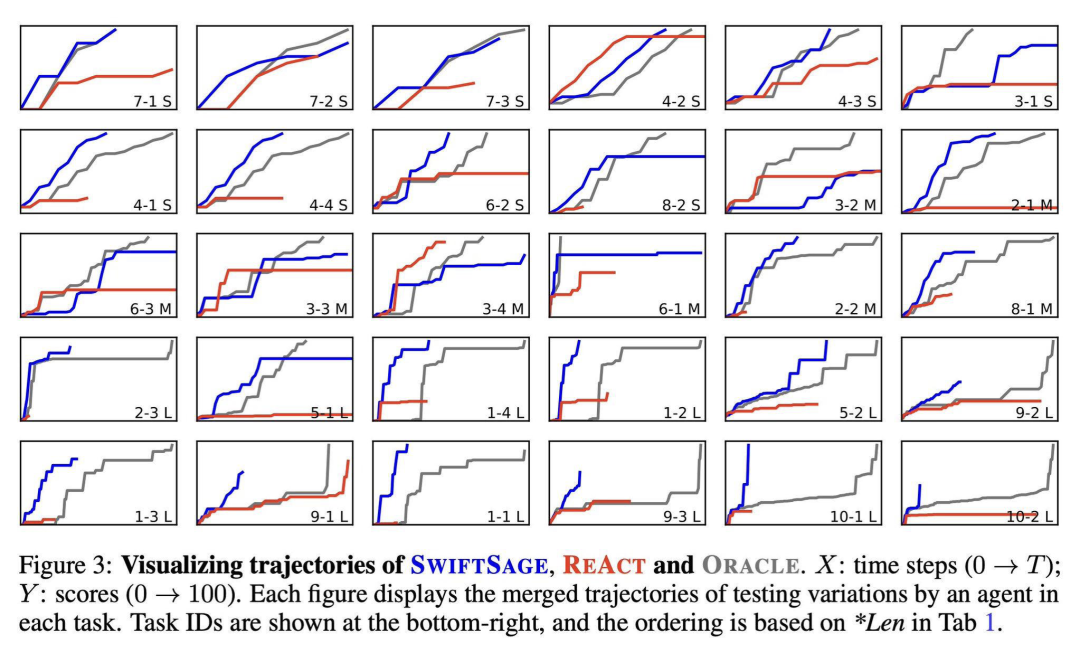 此外,SwiftSage 在交互式任务中的效率同样更高。如下图所示,SwiftSage 能够在较少的行动数内达到相同的分数。