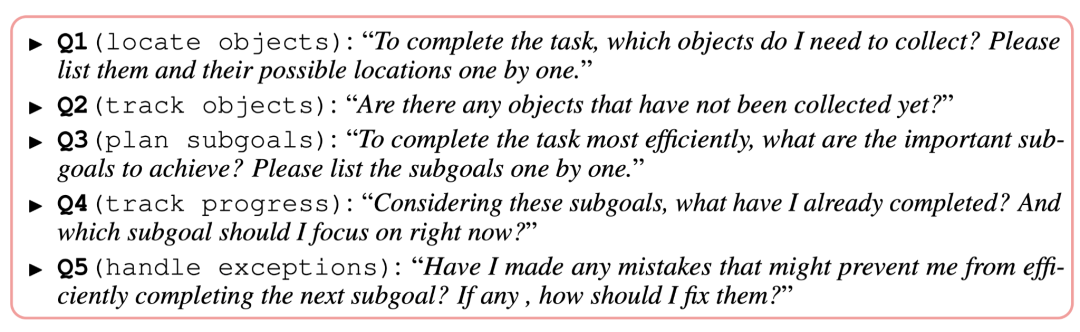 在规划阶段,主要目标是引导 LLM 定位所需物品、规划和追踪子目标以及检测和修正潜在的异常和错误。通过五个主要问题来实现这一目标,使得智能体能够更敏锐地捕捉游戏过程中的异常,进而更有可能纠正自身行为。