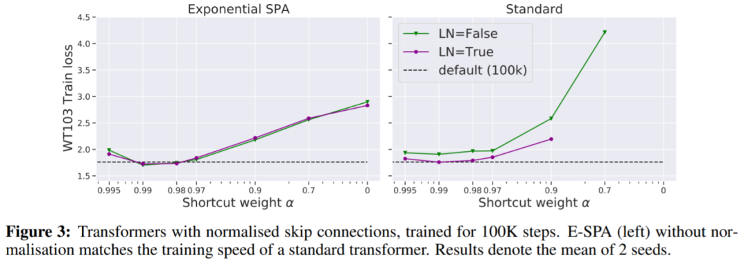 在图 3 中,我们看到一种不需要更多迭代就能匹配默认 transformer 训练损失的方法是使用归一化残差连接。