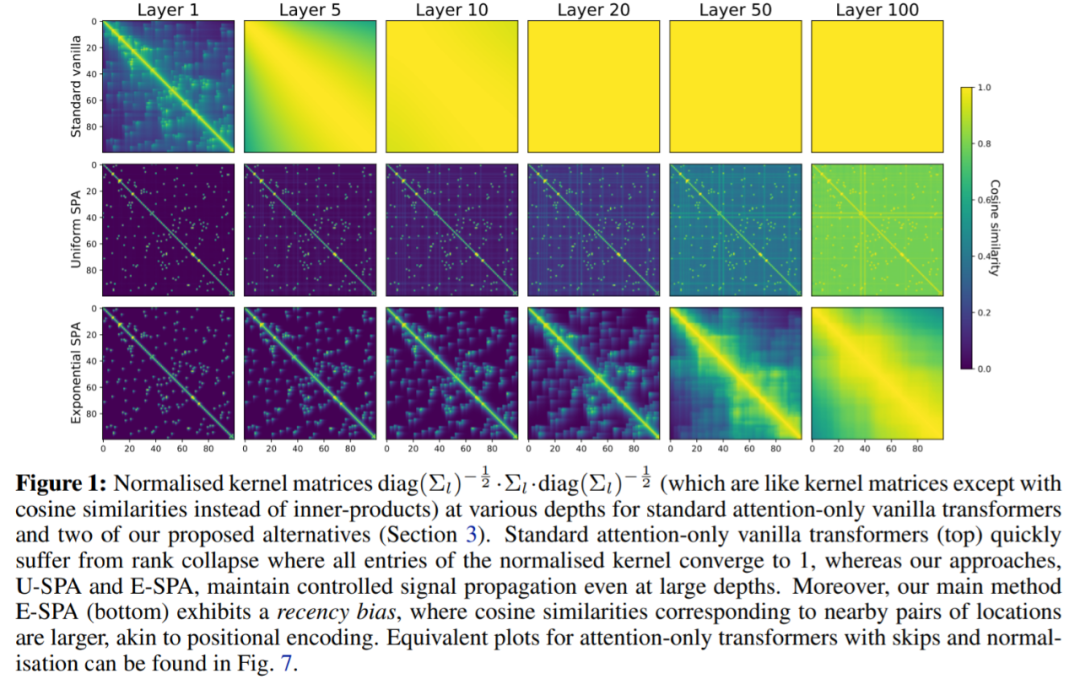 下图中,该研究对提出的两个 SPA 方案进行了验证,U-SPA 和 E-SPA,结果显示即使在网络较深时也能成功地避免仅注意力 vanilla transformers 中的秩崩溃现象。