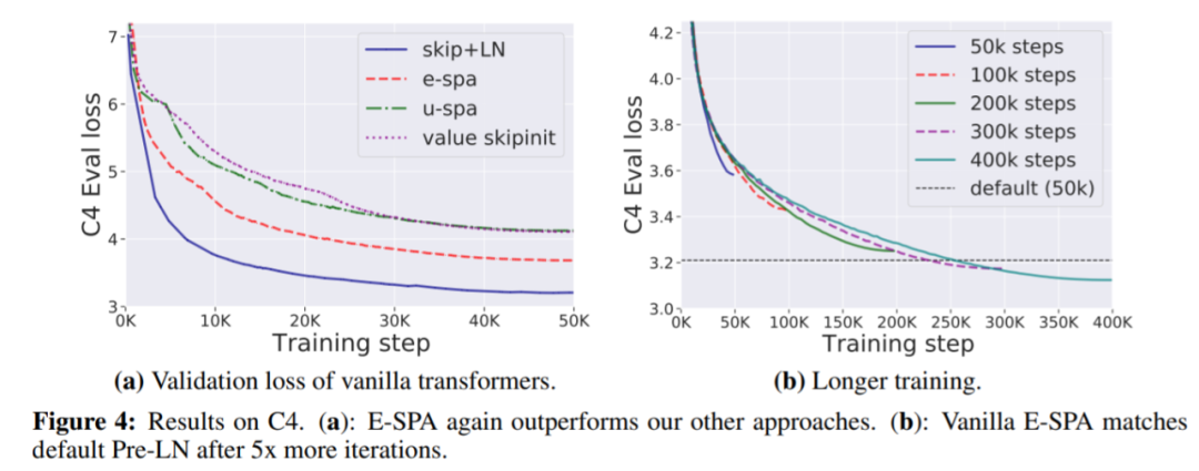在实验部分,在 WikiText-103 和 C4 数据集上,研究者展示了使用他们主要的方法——指数信号保持注意力(Exponential Signal Preserving Attention, E-SPA),可以通过延长大约五倍的训练时间使得标准 transformer 与文中无残差 transformer 的训练损失相当。此外通过将这一方法与残差连接结合,研究者还表明无归一化层的 transformer 能够实现与标准 transformer 相当的训练速度。
