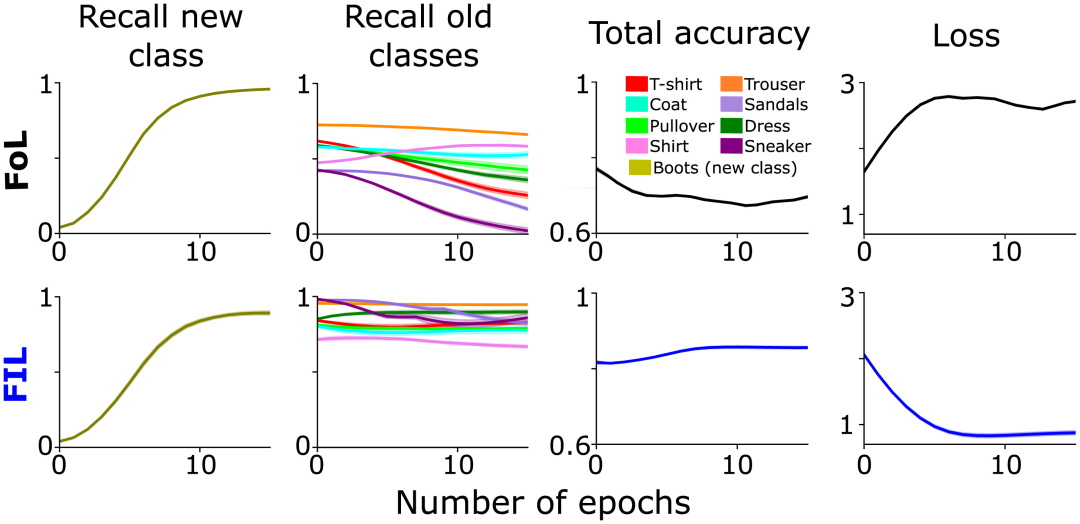 图1:预训练网络在两种情况下学习新“boot”类的性能对比分析:FoL(上)和 FIL(下)。从左到右依次为预测新“boot”类别的召回率(橄榄色)、现有类别的召回率(用不同颜色绘制)、总准确度(高分意味着低误差)和交叉熵损失(总误差的度量)曲线,是保留的测试数据集上与epoch数有关的函数。