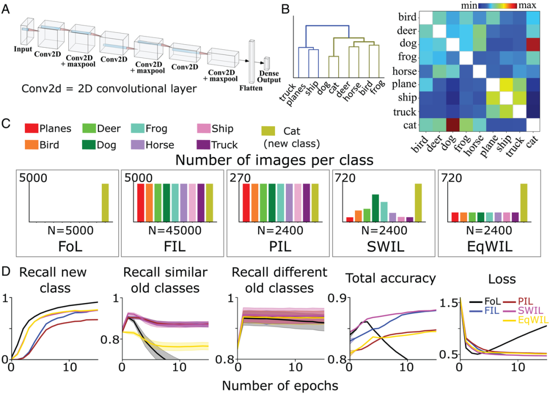 图4:( A ) 作者团队使用具有全连接输出层的6层非线性CNN学习CIFAR10数据集中的8类事物。( B ) 相似度矩阵 (右)是在呈现新的“cat”类之后,作者团队根据最后一个卷积层的激活函数计算获得。对相似矩阵应用层次聚类(左),在树状图中显示动物(橄榄绿)和交通工具(蓝色)两个上义词类别的分组情况。( C ) 作者团队在5种不同的条件下预训练CNN学习新的“cat”类(橄榄绿),直到性能平稳:1)FoL(共计n=5000张图像/epoch);2)FIL(共计n=45000张图像/epoch);3) PIL(共计n=2400张图像/epoch);4) SWIL(共计n=2400张图像/epoch);5) EqWIL(共计n=2400张图像/epoch)。每个条件重复10次。(D)FoL(黑色)、FIL(蓝色)、PIL(棕色)、SWIL(洋红色)和 EqWIL(金色)预测新类别、相似旧类别(CIFAR10数据集中的其他动物类)和不同旧类别(“plane” 、“ship” 和 “truck”)的召回率,预测所有类别的总准确率,以及在测试数据集上的交叉熵损失,其中横坐标都是epoch数。
