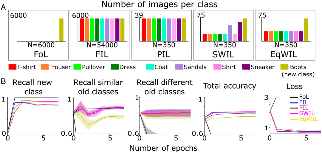 图3 ( A ) 作者团队在五种不同的学习条件下预训练神经网络学习新的“boot”类(橄榄绿),直到性能平稳:1)FoL(共计n=6000张图像/epoch);2)FIL(共计n=54000张图像/epoch);3) PIL(共计n=350张图像/epoch);4) SWIL(共计n=350张图像/epoch)和 5) EqWIL(共计n=350张图像/epoch)。(B)FoL(黑色)、FIL(蓝色)、PIL(棕色)、SWIL(洋红色)和 EqWIL(金色)预测新类别、相似旧类别(“sneaker”和“sandals”)和不同旧类别的召回率,预测所有类别的总准确率,以及在测试数据集上的交叉熵损失,其中横坐标都是epoch数。