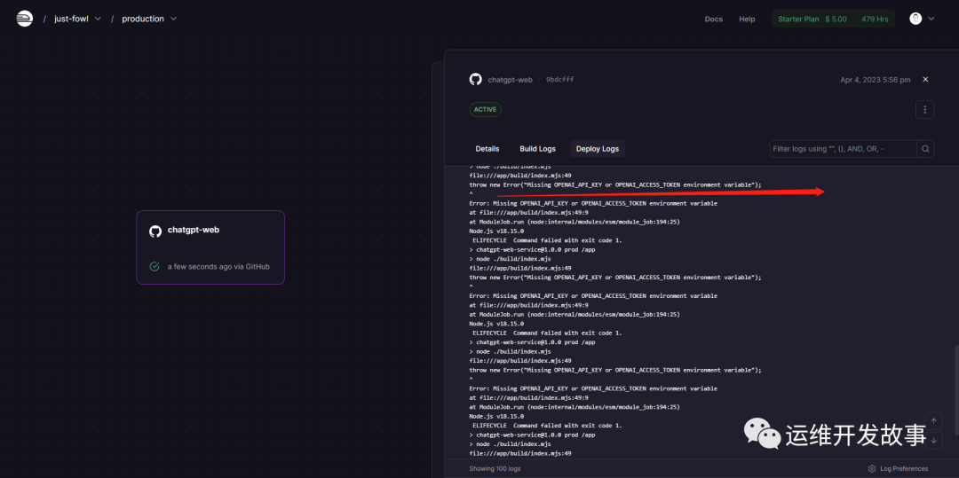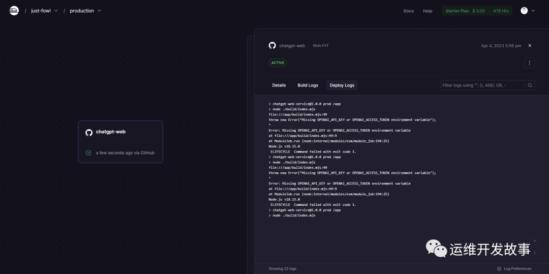 为了能够正常启动,我们需要添加OPENAI_API_KEY或者OPENAI_ACCESS_TOKEN参数,我这里使用前者,另外还要添加一个PORT参数,默认3002端口。除此之外我还添加了AUTH_SECRET_KEY参数,主要是为我们自己的 GPT 增加一层访问控制,避免任何人都能使用。