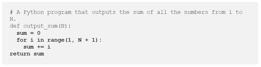 假设你让 CS 的入门学生写一个迭代的 Python 程序,输出从 1 到 N 的所有数字的和。拥有 Copilot 的学生只需要将问题语句作为注释复制并粘贴到 IDE 中,然后输入函数定义「def output_sum(N):」并按 Tab 键就可以获得剩下的内容(加粗部分都是 Copilot 生成的)。