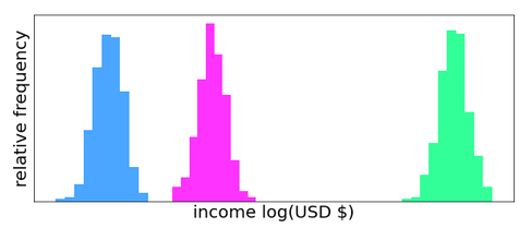 随着新理论的爆炸式发展,在过去二十年中,最优运输已成为许多新的统计和人工智能算法的中心。在几乎每个统计算法中,数据都被显式或隐式地建模为具有某种潜在的概率分布。例如,如果收集不同国家的个人收入数据,则该人口收入在每个国家都存在概率分布。如果希望根据人口的收入分布对两个国家进行比较,那么需要一种方法来衡量这两个分布之间的差距。这正是优化运输(尤其是Wasserstein距离)在数据科学中变得如此有用的原因。然而,Wasserstein距离并不是衡量两个概率分布相距距离的唯一指标。事实上,由于它们与物理学和信息论的联系,L-2距离和Kullback-Leibler(KL)散度这两种选择在历史上更为常见。Wasserstein距离相对于这些替代方案的主要优势在于,它在计算距离时同时考虑了值及其概率,而L-2距离和KL散度仅考虑概率。下图显示了一个关于三个虚构的国家收入的人工数据集的示例。