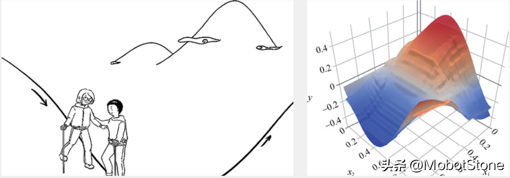 从上面的解释中,就不难理解为何刚才我们要提到函数的凹凸性了。因为,在非凸函数中,有可能还没走到山脚,而是到了某一个山谷就停住了。也就是说,对应非凸函数梯度下降不一定总能够找到全局最优解,有可能得到的只是一个局部最优解。然而,如果函数是凸函数,那么梯度下降法理论上就能得到全局最优解。