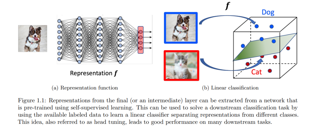点(a)表明,未标记的某些结构属性隐式地为我们提供了有关后续下游任务的提示,而自监督学习可以帮助从数据中梳理出这个信号。点(b)提出了一种简单且经验上有效的方法来使用预训练模型,利用模型的学习表示。本文识别并在数学上量化了未标记数据的分布属性,对于不同的SSL方法,如对比学习、语言建模和自我预测,可以证明可以学习到良好的表示。在下一节中,我们将深入研究表示学习的思想,并形式化解释为什么自监督学习有助于下游任务。