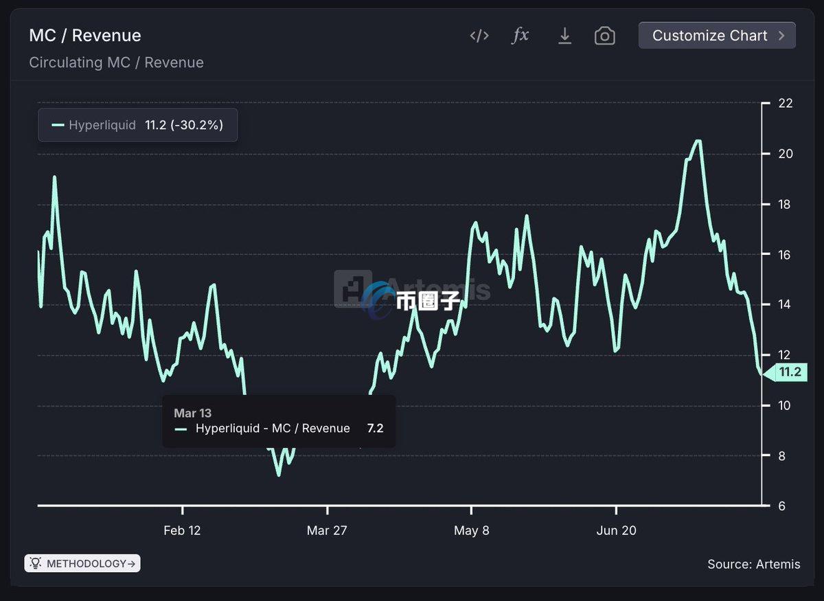 他强调,相较于营收成长,其市值扩张却较为保守,目前市值/营收比(MC/Revenue)仅11.2倍,为三月低点(7.2倍)以来新低。对比其他加密企业与金融科技公司,这个数字让Hyperliquid显得相对低估:
