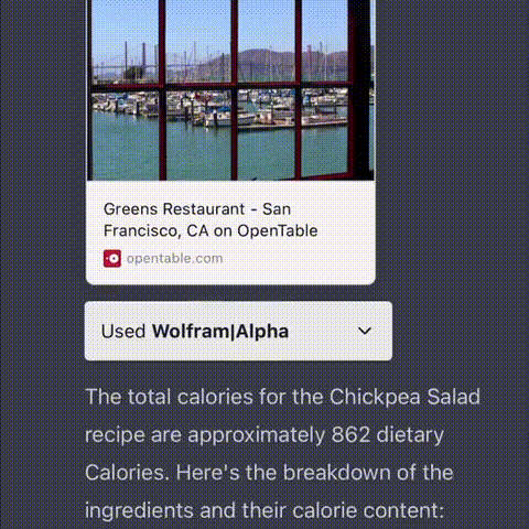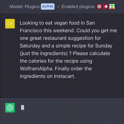 比如你问它,“我正在旧金山,这个周末想吃素食,能不能建议我周六去哪家参观?周日按什么食谱做菜?并且用WolframAlpha计算出食谱的热量,然后在Instacart上订购食材。”