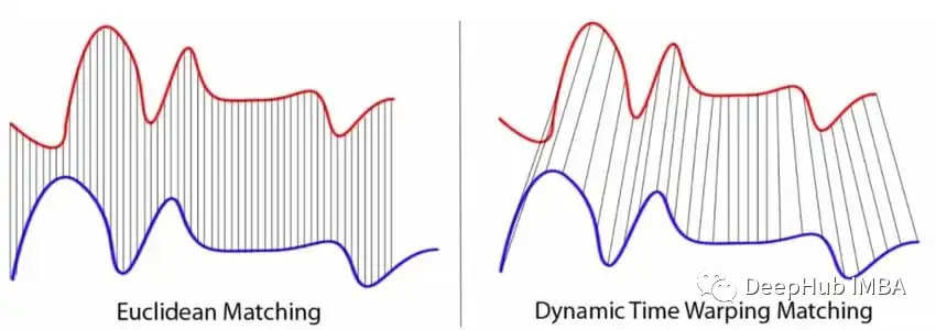 而DTW 可以解决 p 范数的两个限制。经典的 DTW 可以最小化时间戳可能不同的两个时间序列点之间的距离。这意味着轻微偏移或扭曲的 TS 仍然被认为是相似的。下图可视化了基于 p 范数的度量与 DTW 的工作方式之间的差异。