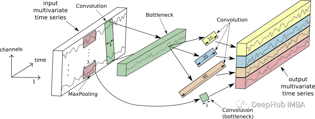 在2020 年还发布了 InceptionTime 网络。InceptionTime 是五个深度学习模型进行的集成,其中每个模型都是由 Szegedy 等人首先提出的InceptionTime创建的。这些初始模块同时将多个不同长度的过滤器应用于 TS,同时从 TS 的较短和较长子序列中提取相关特征和信息。下图显示了 InceptionTime 模块。