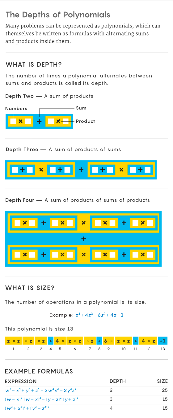 为了简化多项式,计算机科学家将它们限制为一种固定形式,并具有称为「恒定深度」的属性,其中和、乘积的模式不会随着问题的增长而改变。这使得它们的大小更加固定,多项式的大小会随着其深度的增加而减小。某个恒定深度的表达式称为公式。恒定深度让多项式的研究取得了更多进展。