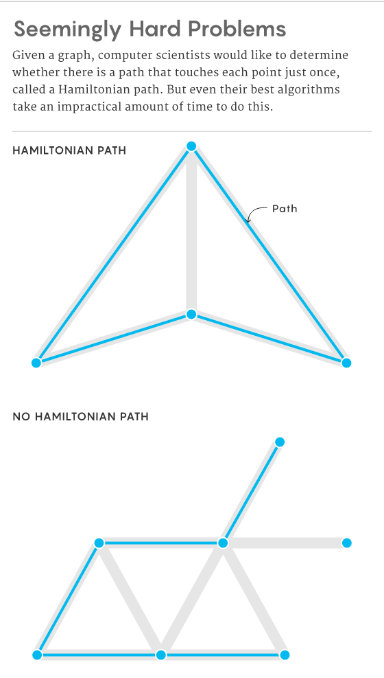 他们开始怀疑有些问题是本质上难度太大,无论问题的规模是大是小都难以解决。例如在图中,一个重要的问题是确定是否存在一条哈密顿路径,即存在一条路径通过且仅通过每个顶点一次。增加点(和边)的数量应需要更长的时间来确定是否存在这样的路径,但即便是最好的算法,随着图规模的增加,花费的时间也会呈指数增长,这使得解决这个问题变得不切实际。