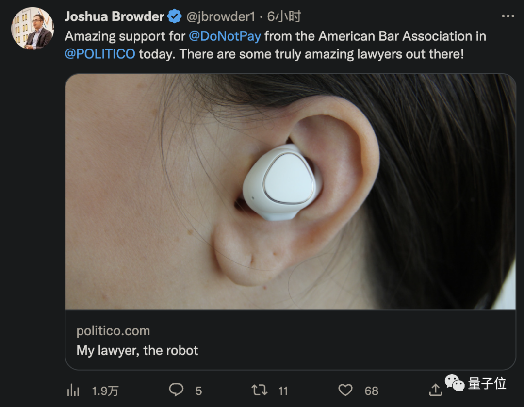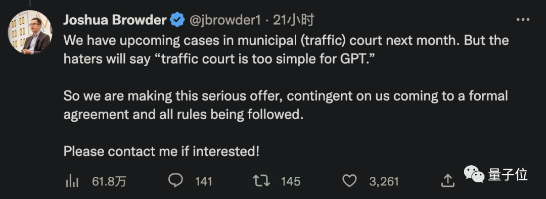 就在今天,来自美国一家机器人律师公司的CEO发了这样一条抓人眼球的消息。